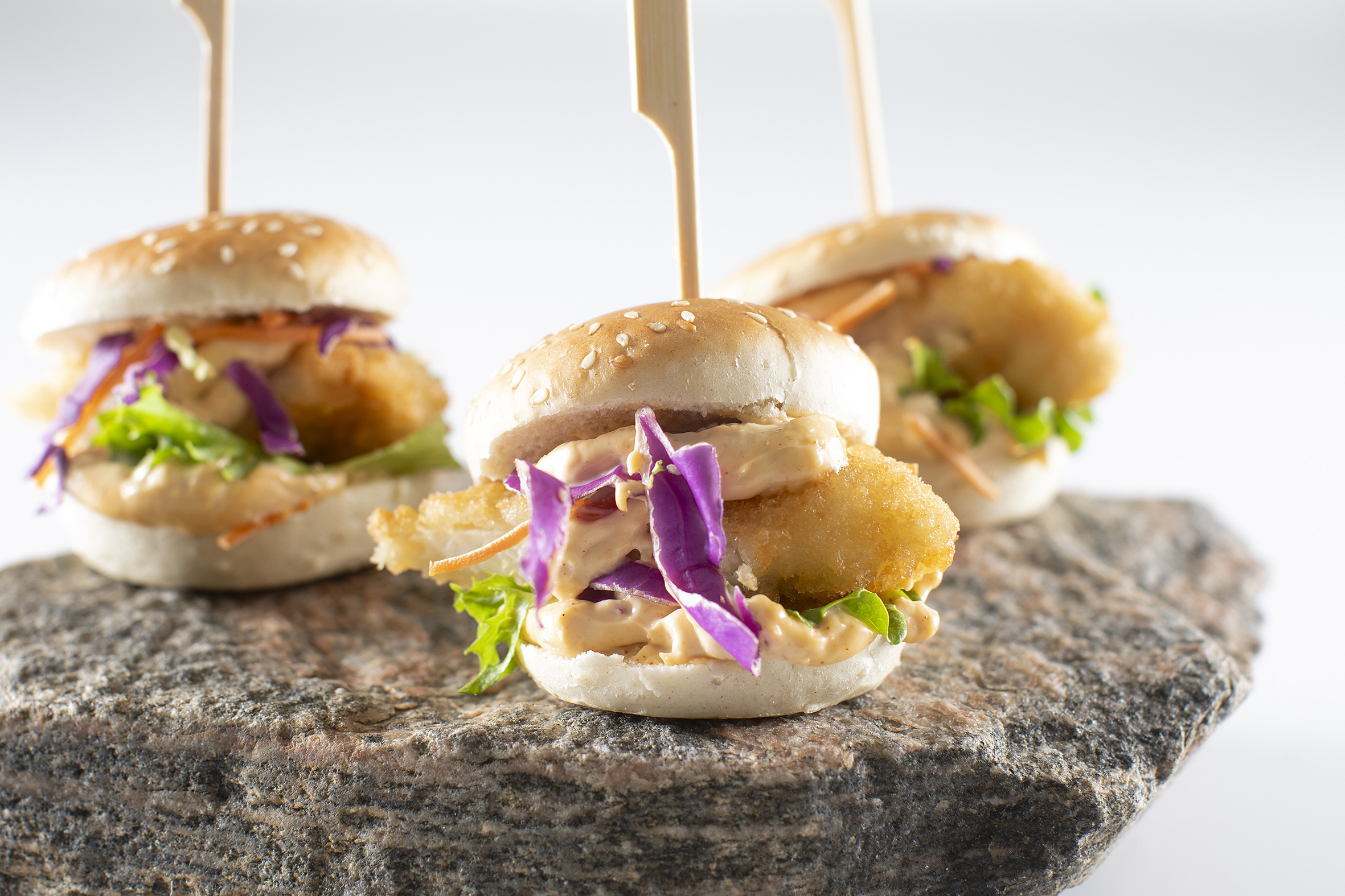 Den friske med røget laks og rygeost, hvor skiver af hjemmerøget laks får følgeskab af en luftig rygeostcreme, der med sin letrøget smag gør laksen endnu bedre. - Sliders med chicken og mild chilimayo